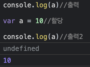 위의 consele.log는 아직 값이 없는 undefined를 출력하고 변수에 값 10에 할당하고 난 후의 consele.log는 변수 값 10이 출력되었다.