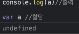 코드가 진행되는 순서는 위에서 아래인 순이여서 이대로 실행하면 첫 번째 줄은 a가 등록되기 전이니 ReferenceError(참조 에러)가 나온다고 생각할 수 있다. 하지만 자바스크립트의 특징인 호이스팅이 있기에 변수를 가상으로 끌어올려 실행한다.